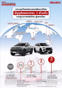 -อีซูซุประกาศความสำเร็จครั้งประวัติศาสตร์ส่งท้ายปีด้วยยอดการส่งออกรถอีซูซุทั้งรถปิกอัพ “อีซูซุ       ดีแมคซ์” และ รถยนต์นั่งอเนกประสงค์ “มิว-เอ็กซ์” จากฐานการผลิตในประเทศไทยไปสู่ตลาดโลกครบ 3,000,000 คัน อย่างเป็นทางการ นับเป็นการยืนยันถึงคุณภาพมาตรฐานระดับโลก ตอกย้ำศักดิ์ศรี การเป็น “โปรดักแชมเปี้ยน” ที่สร้างมูลค่าทางเศรษฐกิจและภาพลักษณ์อันแข็งแกร่งให้ประเทศไทในตลาดโลก สะท้อนความเชื่อมั่นที่ลูกค้าทั่วโลกมีต่อผลิตภัณฑ์อีซูซุที่ผลิตจากฐานการผลิตในไทย