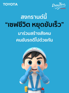 -ในช่วงเทศกาลสงกรานต์ปีนี้ โตโยต้าได้ร่วมมือกับ 3 หน่วยงานหลัก ได้แก่ กรมคุมประพฤติกรมป้องกันและบรรเทาสาธารณภัย (ปภ.) และกองบังคับการตำรวจจราจร (บก.จร.) สนับสนุนอุปกรณ์สำหรับกิจกรรมรณรงค์และการตั้งจุดพักรถใน 8 จังหวัดสำคัญทั่วประเทศ ได้แก่ กรุงเทพมหานคร ฉะเชิงเทรา นครราชสีมา ชลบุรี พระนครศรีอยุธยา นครสวรรค์ ราชบุรี และเพชรบุรี โดยมีการมอบยาดมรวม 30,000 ชิ้น เพื่อแจกจ่ายให้ผู้ขับขี่รู้สึกสดชื่น ผ่อนคลายระหว่างการเดินทาง พร้อมเสื้อกั๊กสะท้อนแสงจำนวน 500 ตัว สำหรับอาสาสมัครในพื้นที่ เพื่อเสริมความปลอดภัยตลอดช่วงการเดินทาง