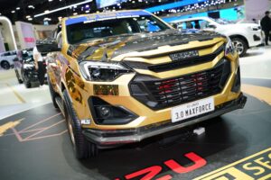 • MU-X “THE NEXT PEAK” รุ่น Active 2.2 Ddi MAXFORCE สีขาวมุกโดโลไมท์ (Dolomite White Pearl) ตกแต่งพิเศษด้วยคอนเซ็ปต์ “JAPANESE SPORT-SUV” สัญลักษณ์แห่งคุณภาพแบบญี่ปุ่น เน้นคุณภาพและความเชื่อมั่นที่วางใจได้ เสริมความโดดเด่นด้วยชุดแต่งบอดี้พาร์ทรอบคันจาก AKC ใส่ชุดโหลดช่วงล่างจาก PROFENDER เสริมลุคสปอร์ตด้วยล้ออัลลอย LENSO รุ่น JAGER APOLLO พร้อมยาง YOKOHAMA ADVAN SPORT ขนาด 265/50R20 ขนาด 20 นิ้ว หยุดรถได้อย่างมั่นใจด้วยระบบเบรกหน้า CALIPER แบบ 6 POT และเบรกหลัง CALIPER แบบ 4 POT พร้อมจานเบรกขนาด 355 มิลลิเมตร จาก Run Stop