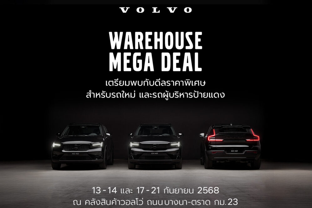 -ครั้งแรกจาก วอลโว่ คาร์ ประเทศไทย กับงาน Volvo Warehouse Mega Deal งานที่เปิดโอกาสให้ผู้สนใจสามารถเลือกซื้อรถใหม่วอลโว่ทุกรุ่น ไม่ว่าจะเป็นรถไฟฟ้า 100% อาทิ Volvo EX90, Volvo EX40, Volvo EC40 และ Volvo EX30 หรือรถปลั๊กอินไฮบริด รุ่น Volvo XC90 โฉมใหม่, Volvo XC90, Volvo XC60 และ Volvo S90 หรือรถผู้บริหาร รถป้ายแดงไมล์น้อย (Volvo Selekt) ถึงคลังสินค้า โดยไม่เพียงลูกค้าสามารถเลือกรุ่นรถ สเปค หรือสีที่ต้องการ แต่ยังสามารถเลือกแคมเปญส่งเสริมการขายที่ปรับได้ดั่งใจบนสิทธิประโยชน์มูลค่า 200,000 – 1,000,000 บาท (แล้วแต่รุ่น) และข้อเสนอเพิ่มเติมในงานซึ่งจะจัดขึ้น ระหว่างวันที่ 13 – 14 และ 17 – 21 กันยายน พ.ศ. 2568 ตั้งแต่เวลา 10.00 – 18.00 น. ณ คลังสินค้าวอลโว่ ถนนบางนา-ตราด กม. 23